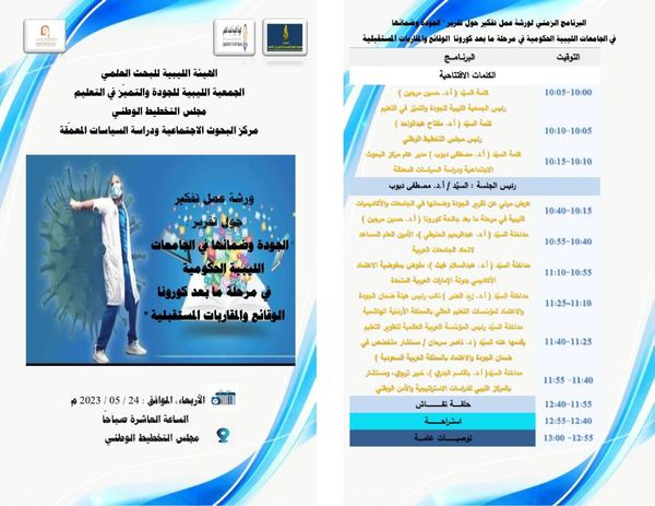 عقدت الجمعية الليبية للجودة والتميز في التعليم بالتعاون مع مجلس التخطيط الوطني، ومركز البحوث الاجتماعية والدراسات المعمقة ورشة عمل لاستعراض ومناقشة تقرير : “الجودة وضمانها في الجامعات الليبية الحكومية في مرحلة ما بعد كورونا الوقائع والمقاربات المستقبلية “، وذلك يوم الأربعاء الموافق 24 مايو 2023م بقاعة اجتماعات مجلس التخطيط الوطني، حيث افتتح فعاليات الورشة الدكتور/ مفتاح عبد الواحد الحرير رئيس مجلس التخطيط الوطني، والذي بدوره أكد في كلمته قيام مجلس التخطيط الوطني بإعداد الاستراتيجية الوطنية للتعليم التي تهدف إلى ضمان جودة التعليم بمراحله المختلفة ، وتحقيق نظام شامل ومستدام في الهيكل التعليمي، وذلك من خلال جهود مشتركة من جميع الأطراف المعنية، فضلا عن تعزيز البحث العلمي، وتحفيز الابتكار والريادة في المجالات العلمية والتكنولوجية، كما أعطيت الكلمة للدكتور / أحمد عبد القادر حيث قدم كلمة الجمعية الليبية للجودة والتميز في التعليم، وكلمة مركز البحوث الاجتماعية ودراسة السياسات المعمقة، حيث أوضح بأن هذه الورشة تأتي في إطار سعي الجمعية والمركز نحو دعم ومساندة برامج وأنشطة الجودة وضمانها في الجامعات الليبية خاصة في مرحلة ما بعد جائحة كورونا.