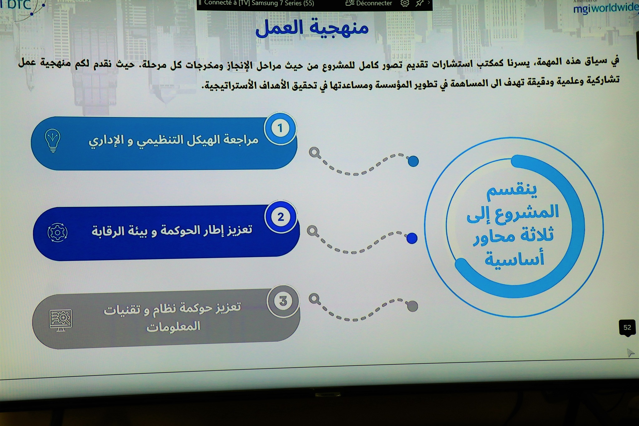 تولى من خلاله السيد المستشار . محمد الساحلي أحد مستشاري شركة استشارات المال والأعمال المتخصصة في مجال التطوير المؤسسي ، استعراض جملة من الأساليب والسبل الهادف إلى تطوير المؤسسات وتعزيز مقوماتها المادية والبشرية ، حيث تناول العرض التطرق إلى العناصر التنظيمية التالية :